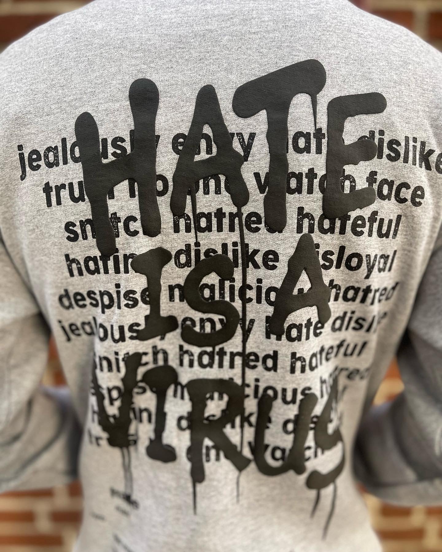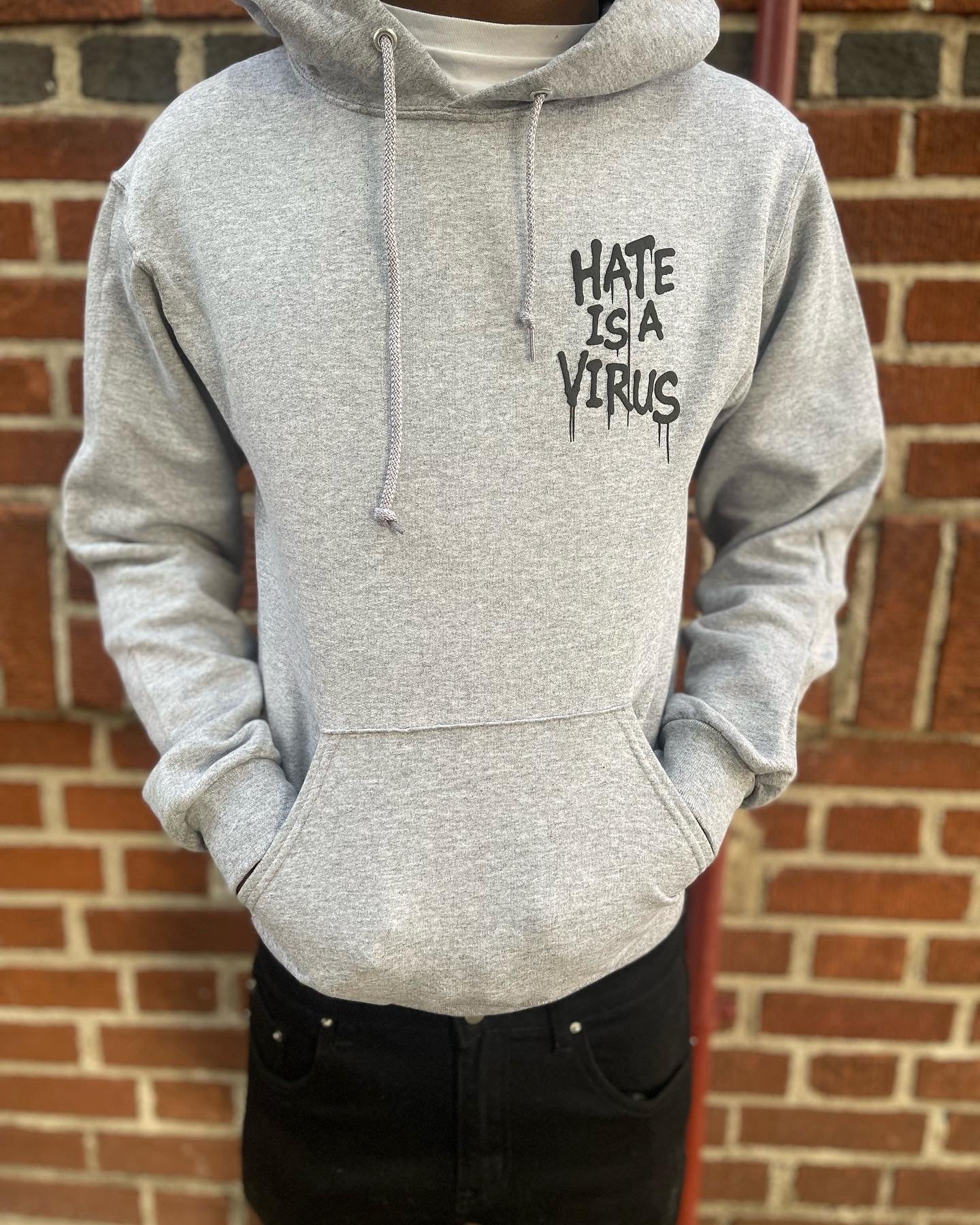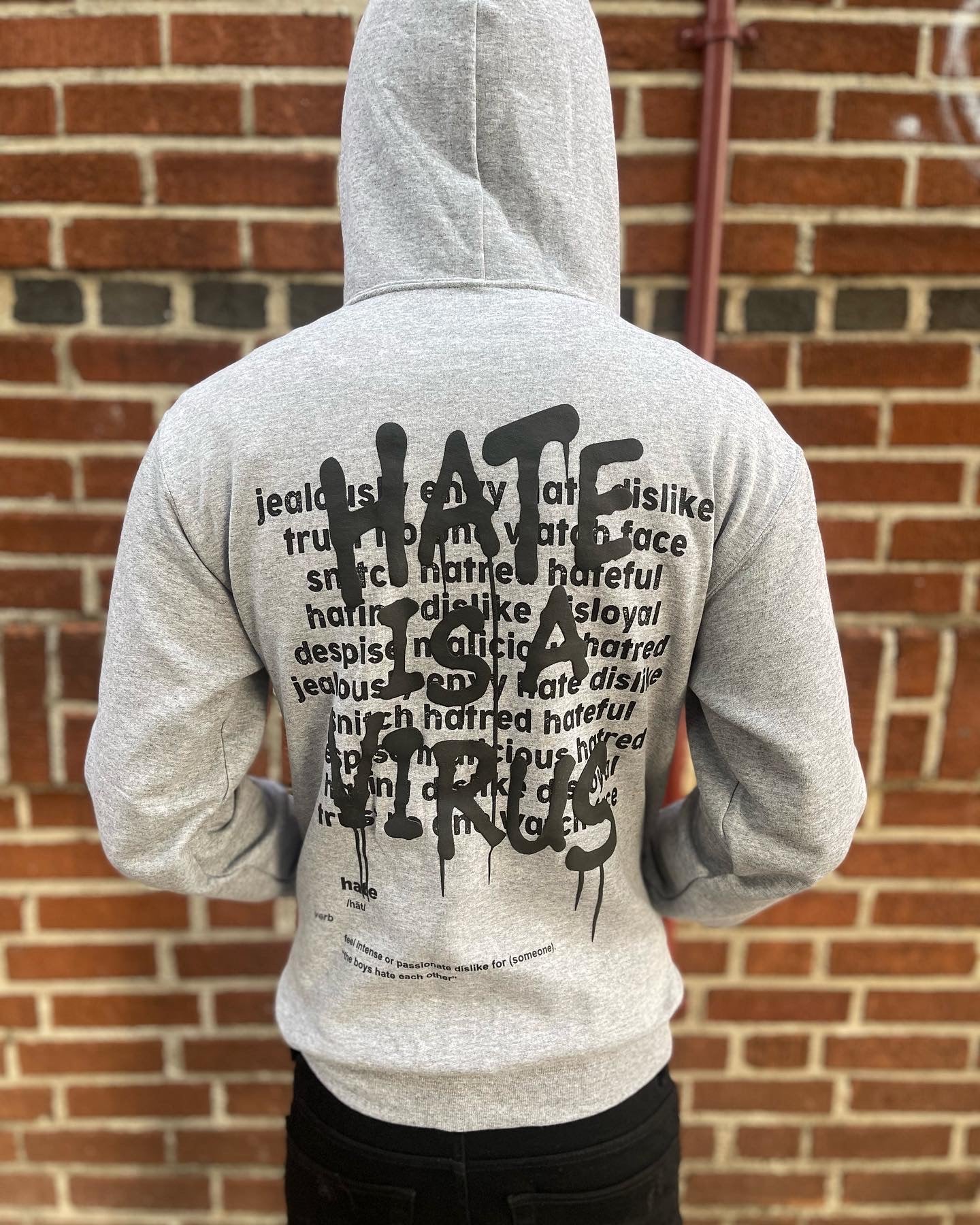 HATE IS A VIRUS Grey Hoody. HATE IS A VIRUS LETTERS ARE RAISED PUFF LETTERS IN FRONT AND BACK IN Black.