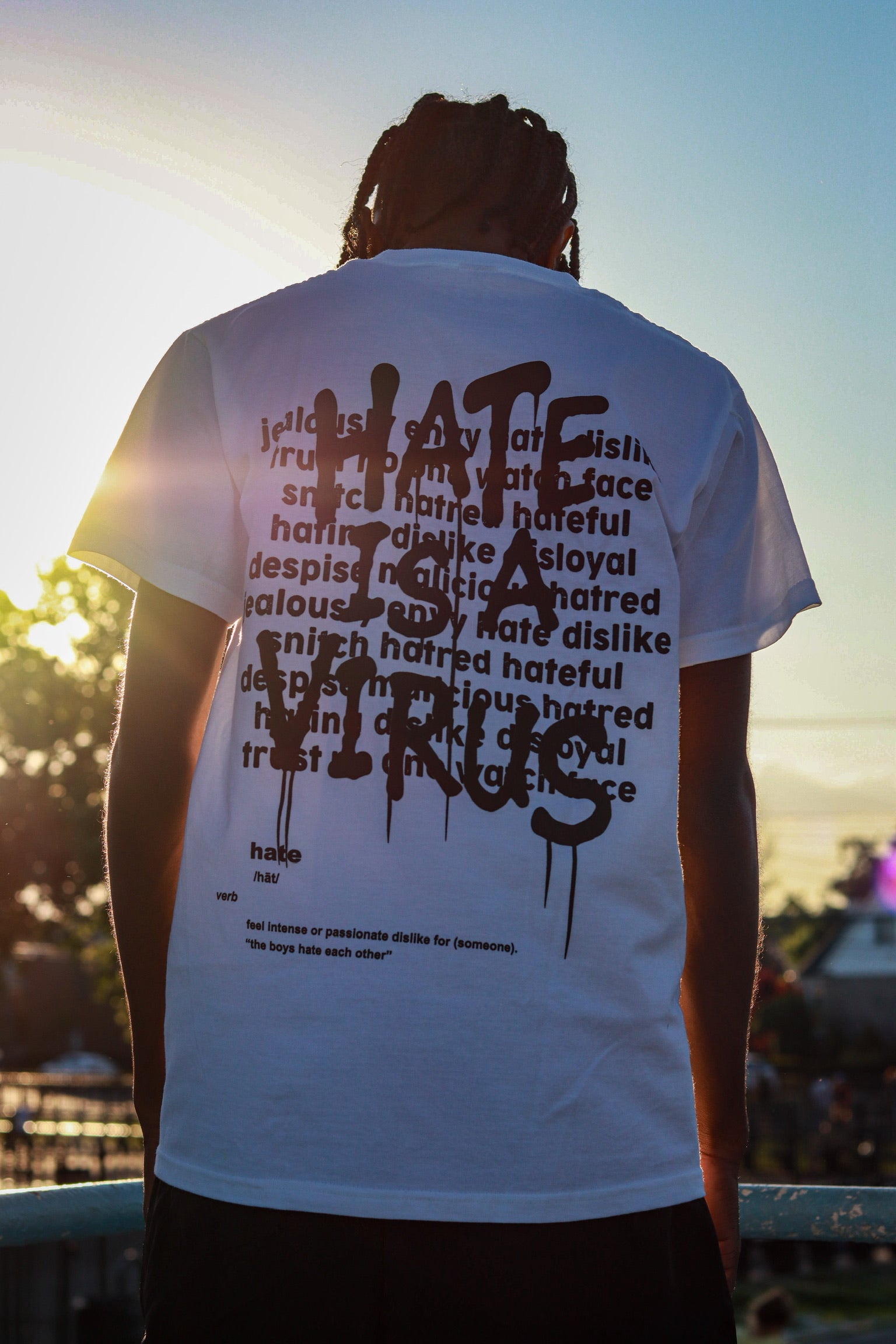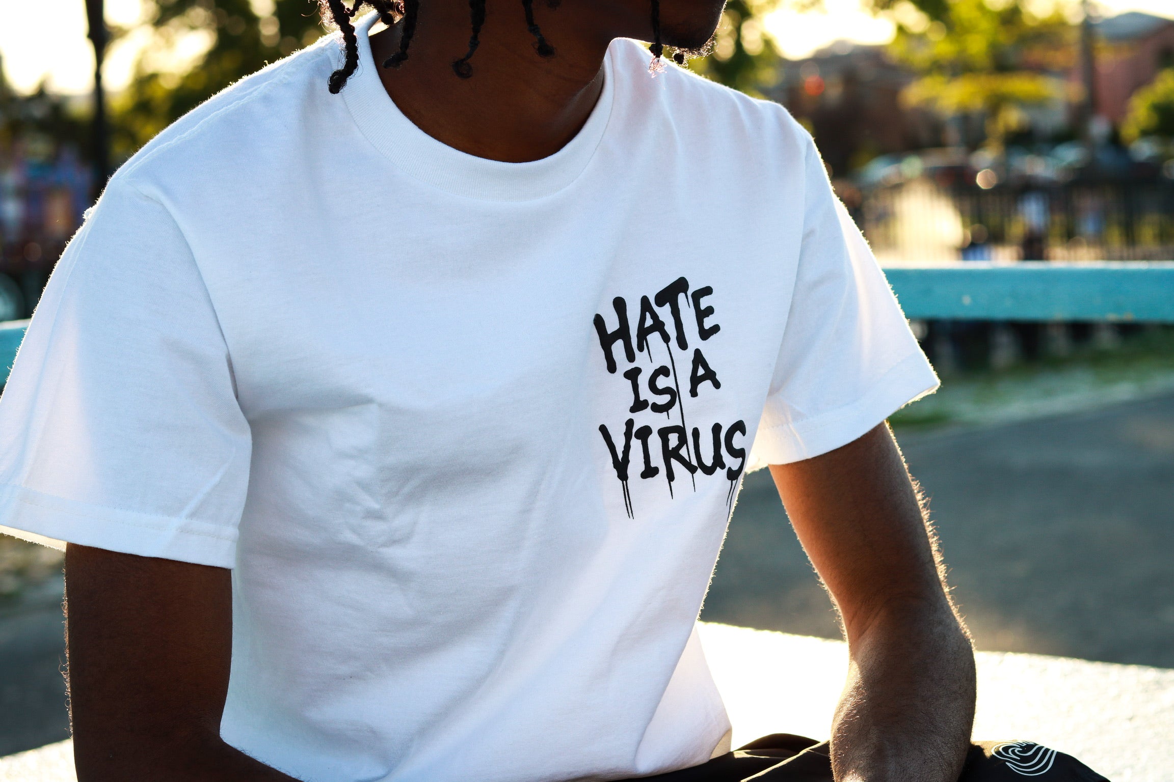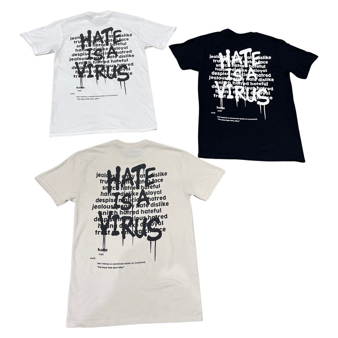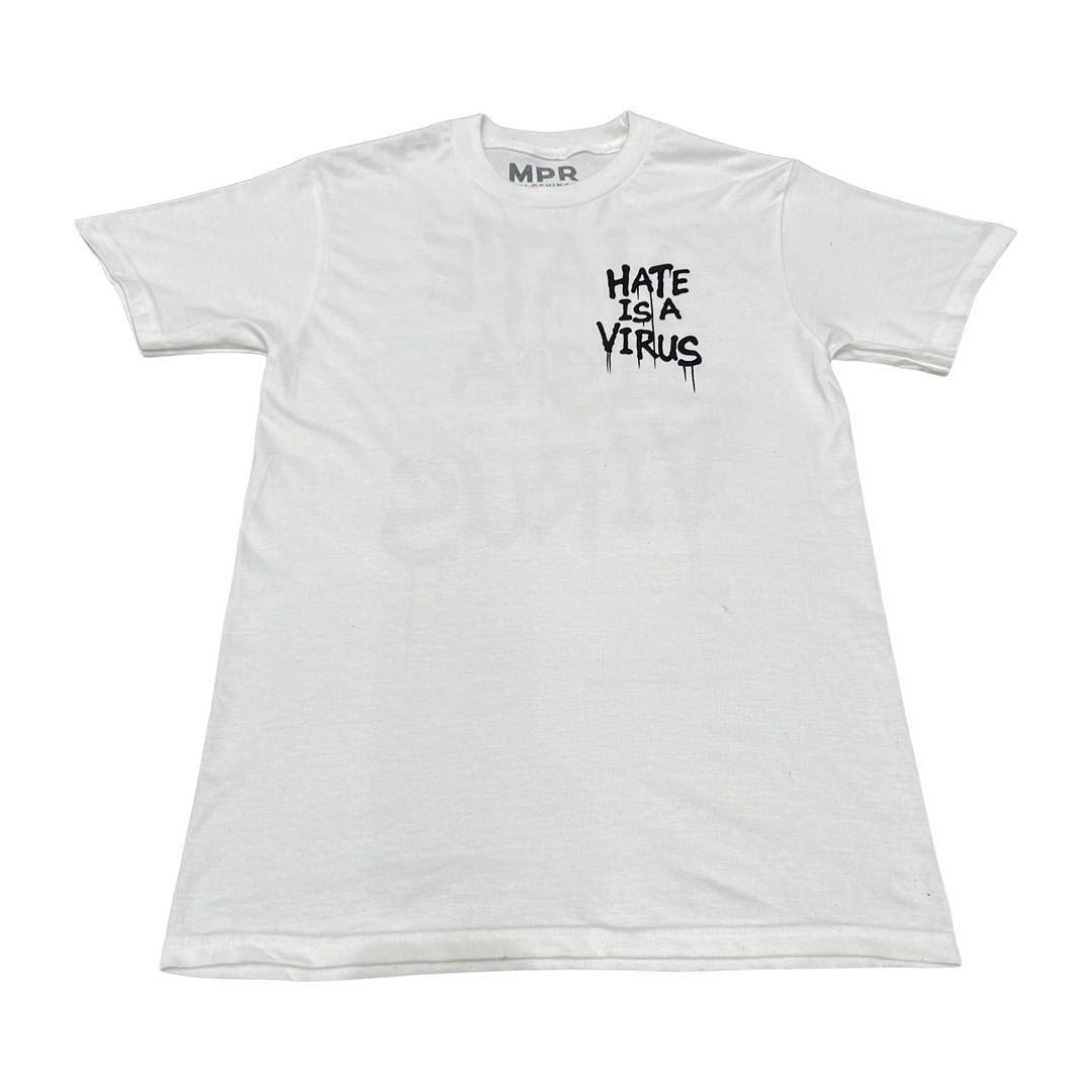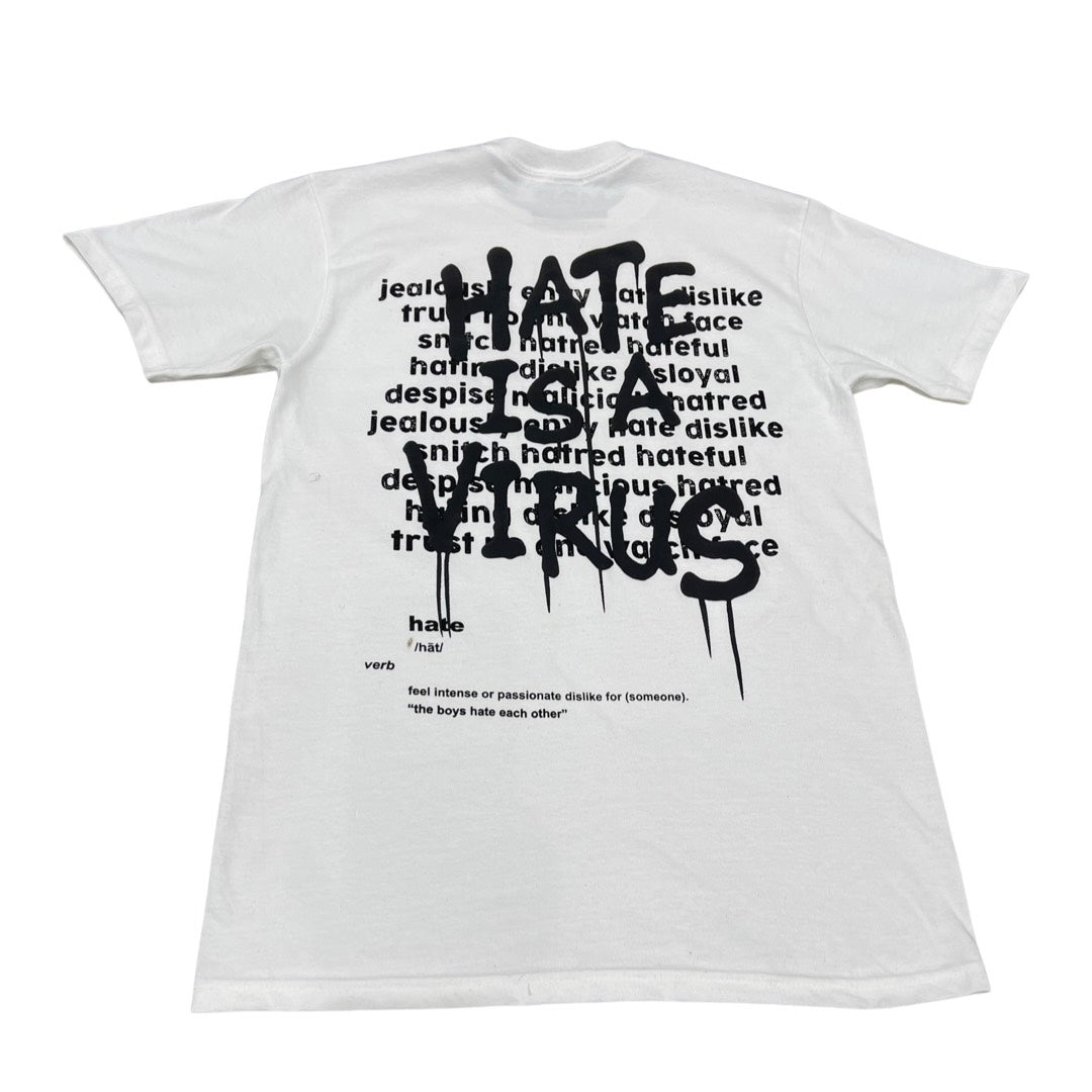 HATE IS A VIRUS White T-Shirt HATE IS A VIRUS LETTERS ARE RAISED PUFF LETTERS IN FRONT AND BACK IN BLACK.
