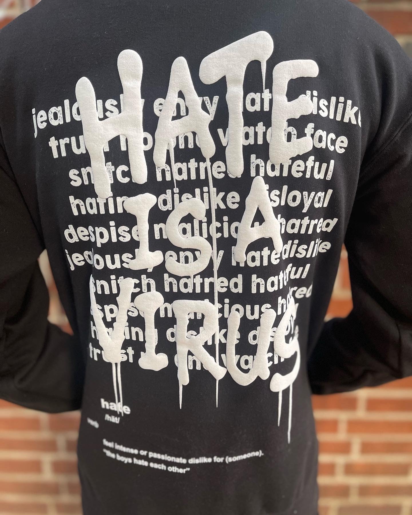 HATE IS A VIRUS Black Hoody. HATE IS A VIRUS LETTERS ARE RAISED PUFF LETTERS IN FRONT AND BACK IN WHITE.