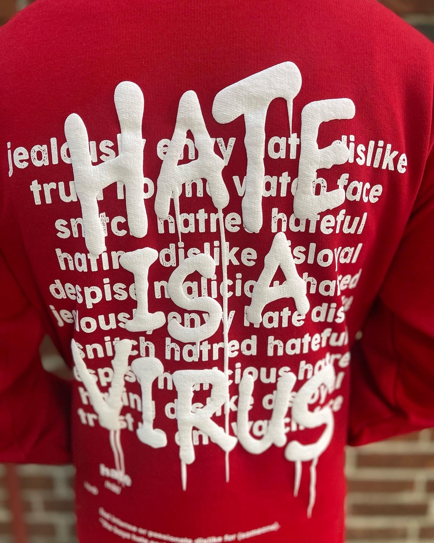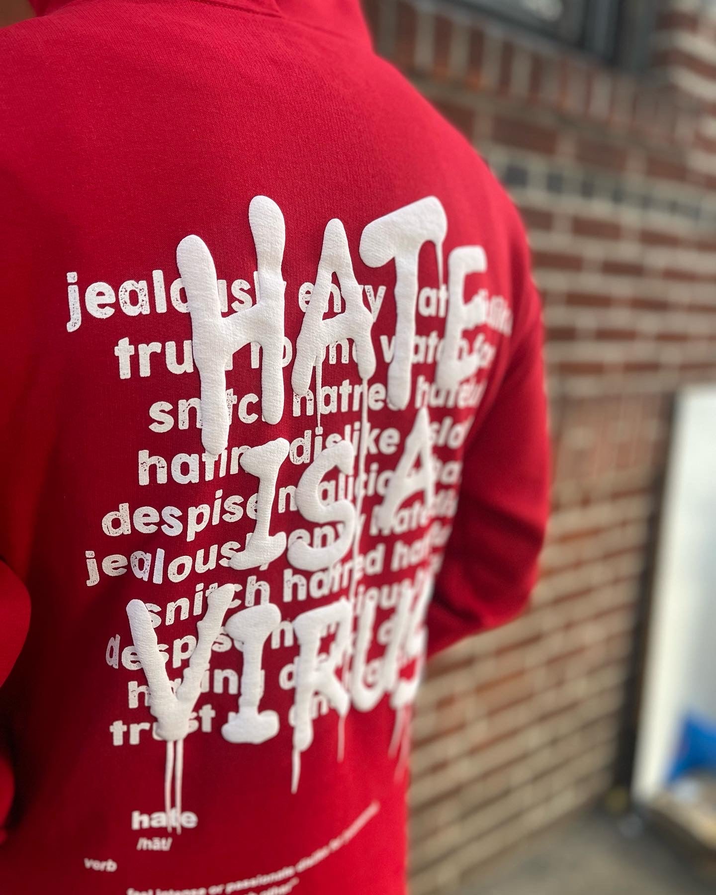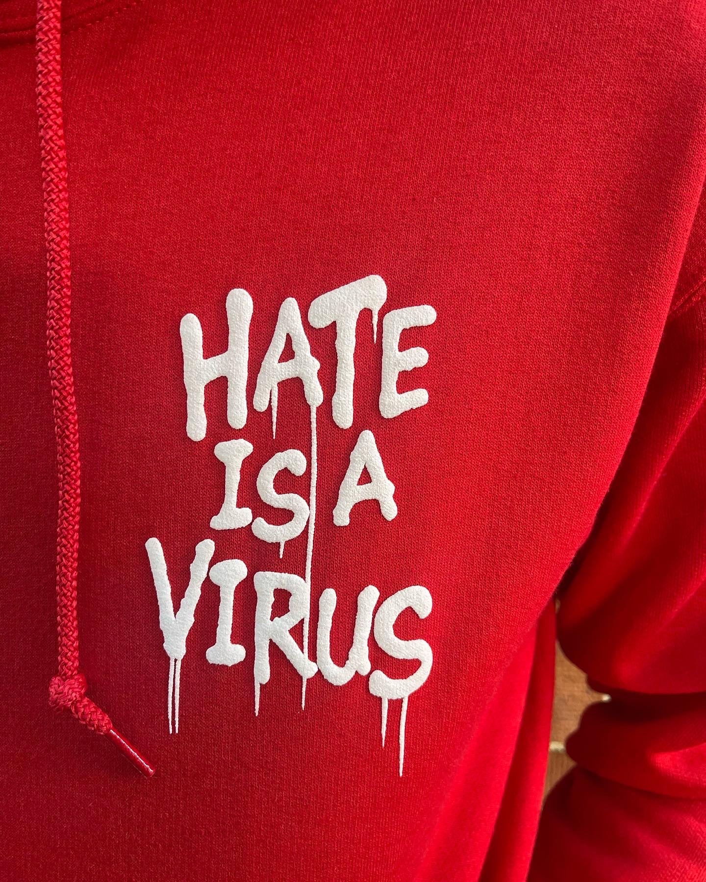 HATE IS A VIRUS Red Hoody. HATE IS A VIRUS LETTERS ARE RAISED PUFF LETTERS IN FRONT AND BACK IN White.