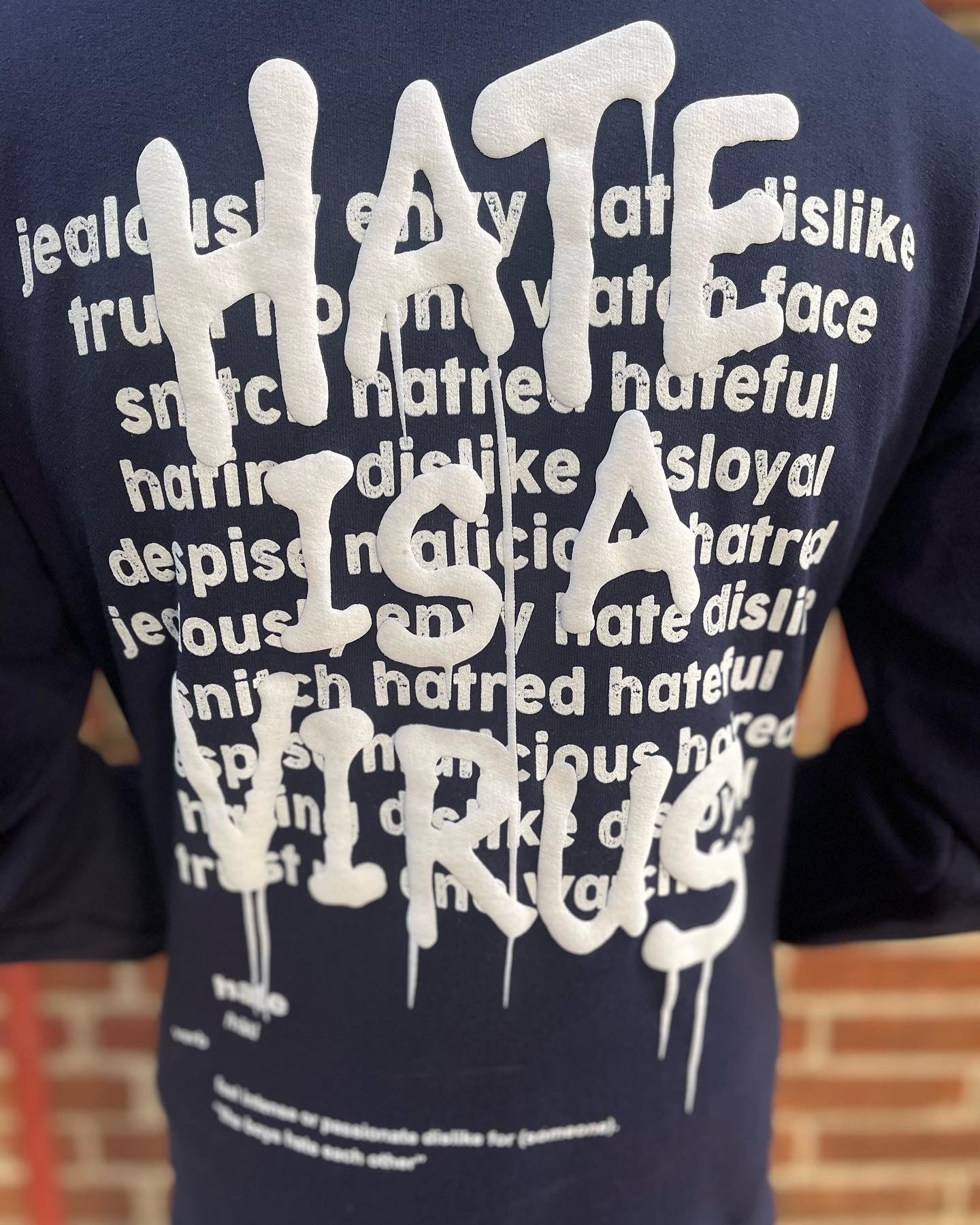 HATE IS A VIRUS Navy Blue Hoody. HATE IS A VIRUS LETTERS ARE RAISED PUFF LETTERS IN FRONT AND BACK IN White.