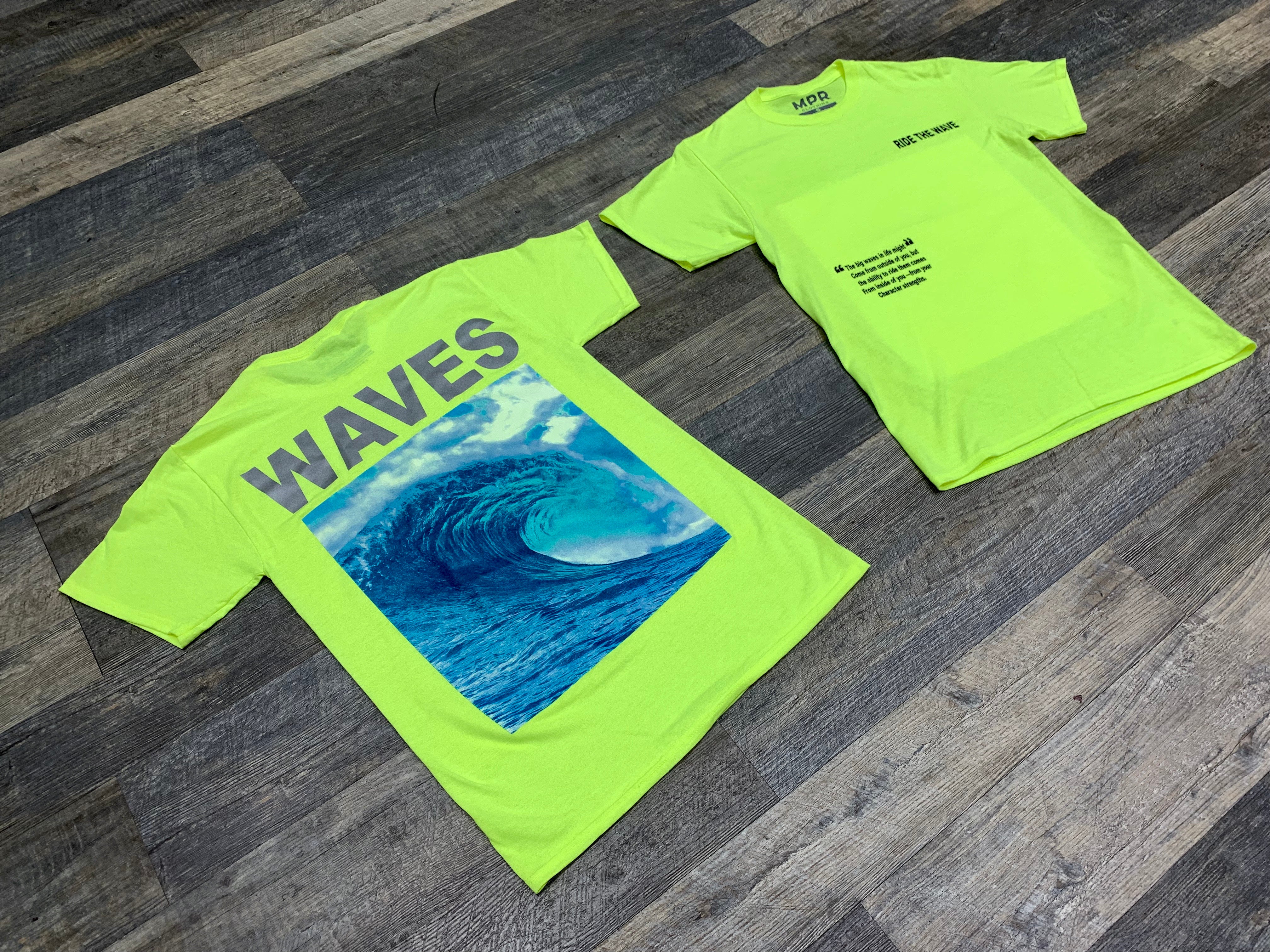 SAFETY GREEN 3M REFLECTOR RIDE THE WAVE T-SHIRT.